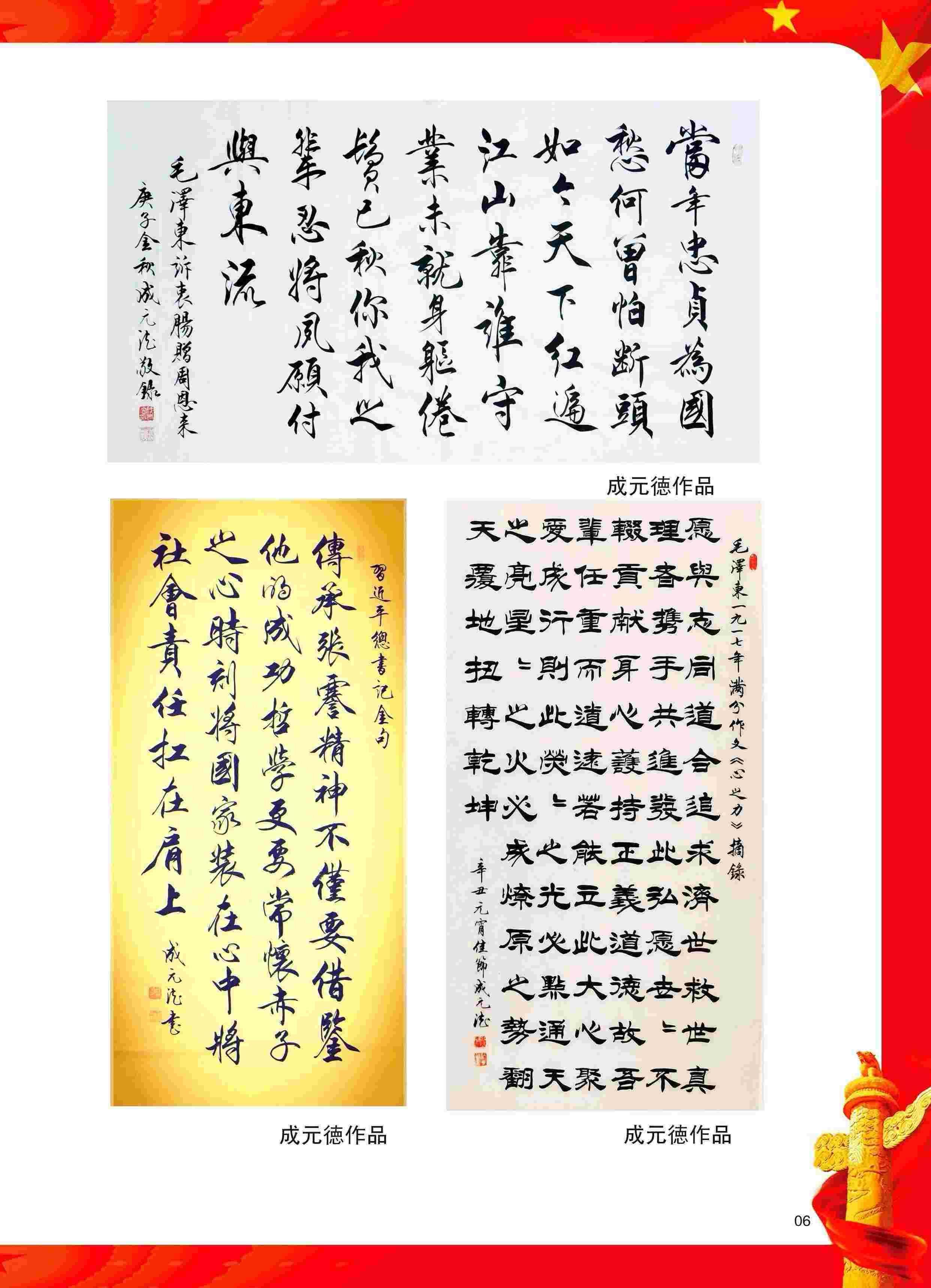 成元德先生的艺术生涯和业绩《人民日报》海外版,《中国日报》《联合国日报》《时代周刊》《中华英才》《紫光阁》特刊等新闻媒体均以整版专题报道。近年来成元德先生又荣获“中国艺术百花奖”“共和国金紫荆奖”金奖。“国家非物质艺术传承奖”金奖,第九届“羲之杯”全国书画大赛一等奖,“百家争鸣杯“全国书画大赛一等奖。被授予“祖国和平统一·特别贡献人物”,“二十大《党旗下的艺术大家》《人民书画家》文艺代表,中央电视台第十九届“中国世纪大采风年度人物”,“中国书画传承艺术名家”“最具收藏价值艺术家”,庆祝建党一百周年“功勋艺术家”等荣誉称号。书画精品先后由诸多国际友人博物馆以及中华人民共和国外交部收藏。