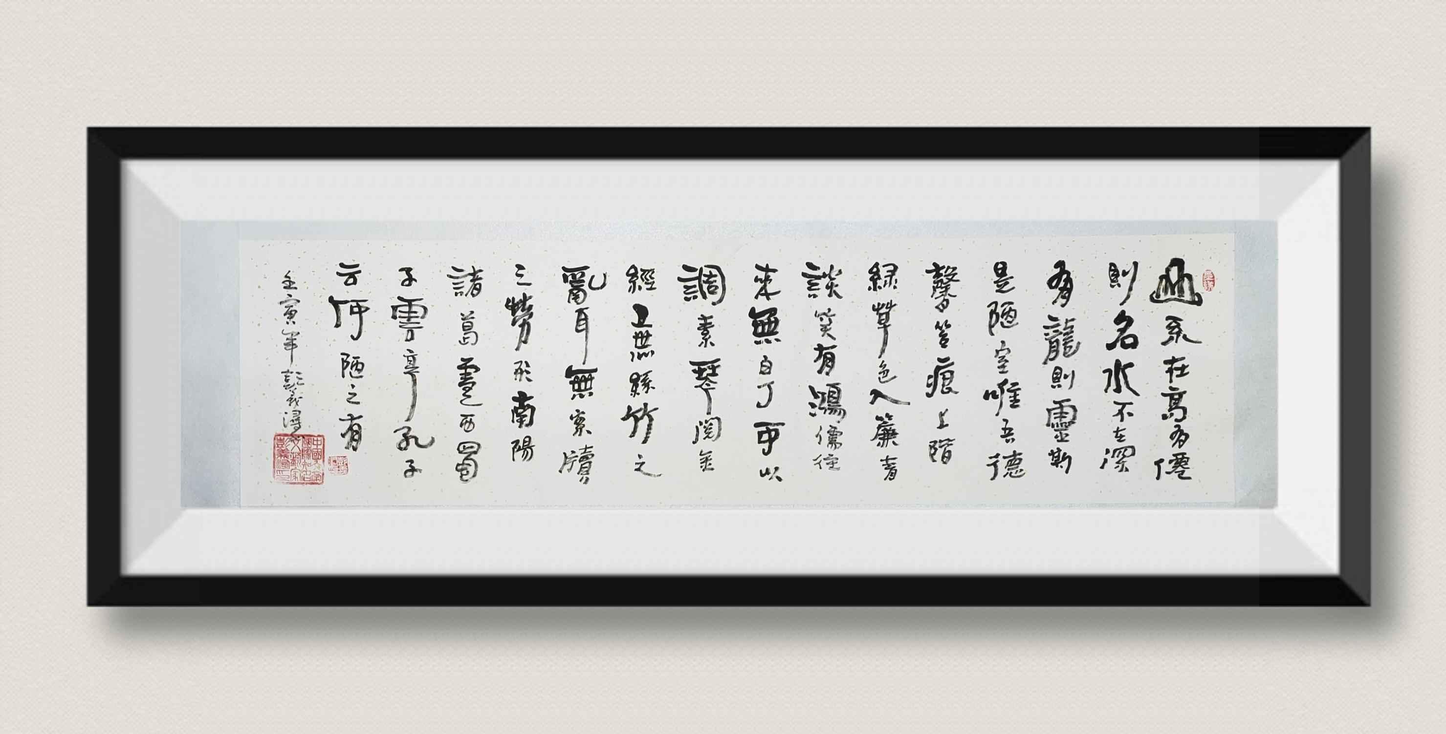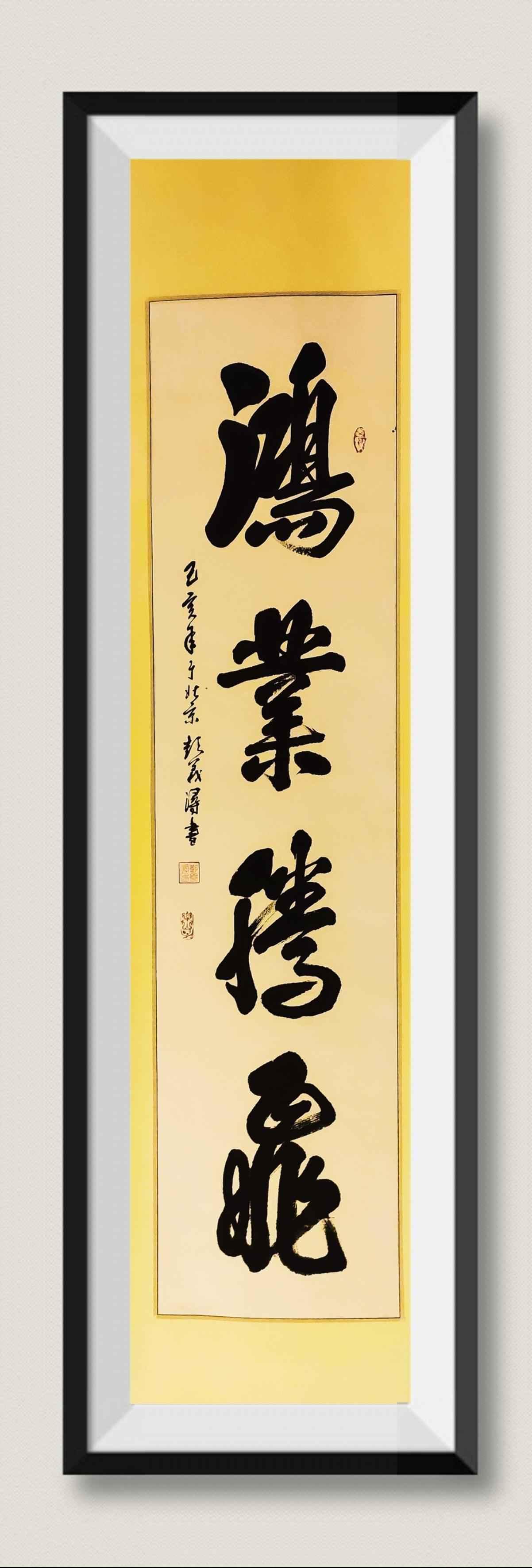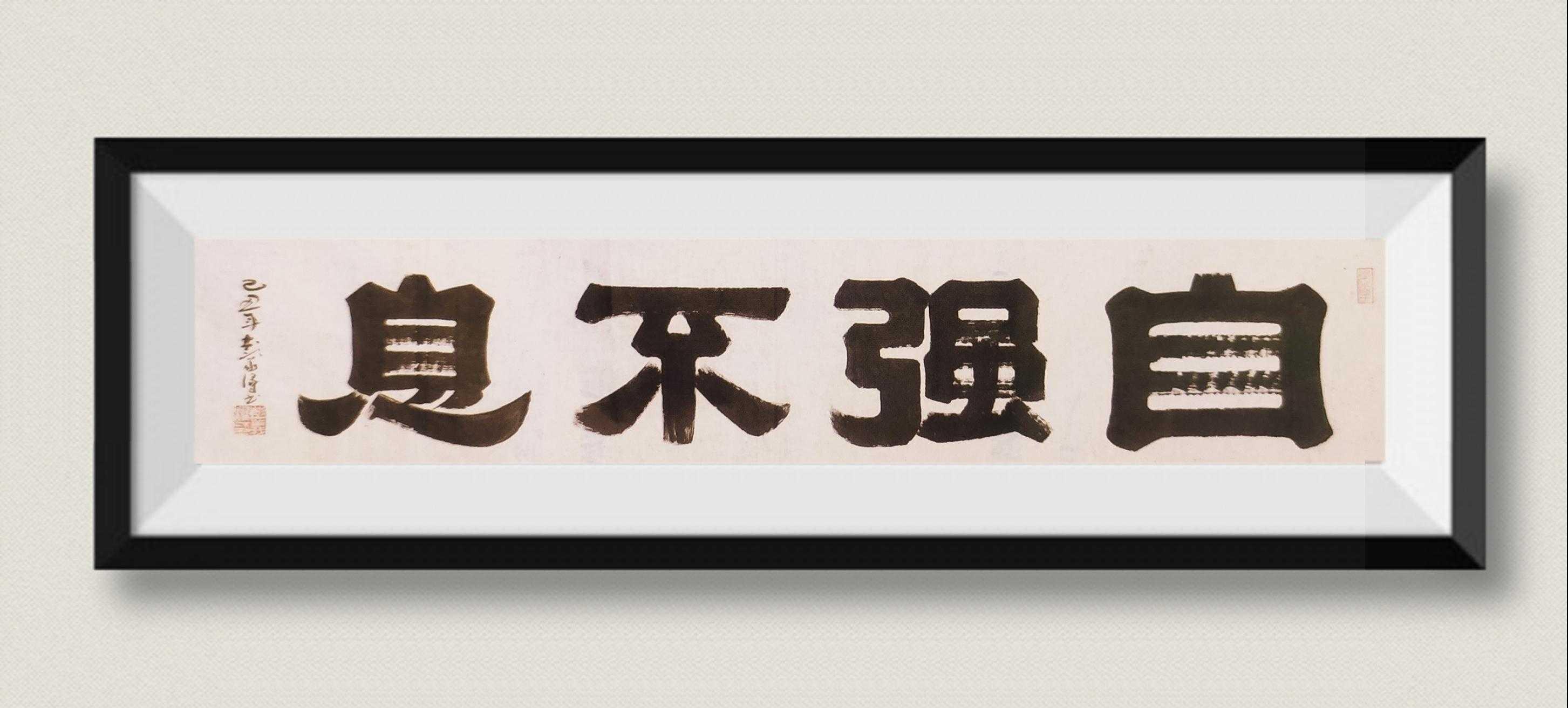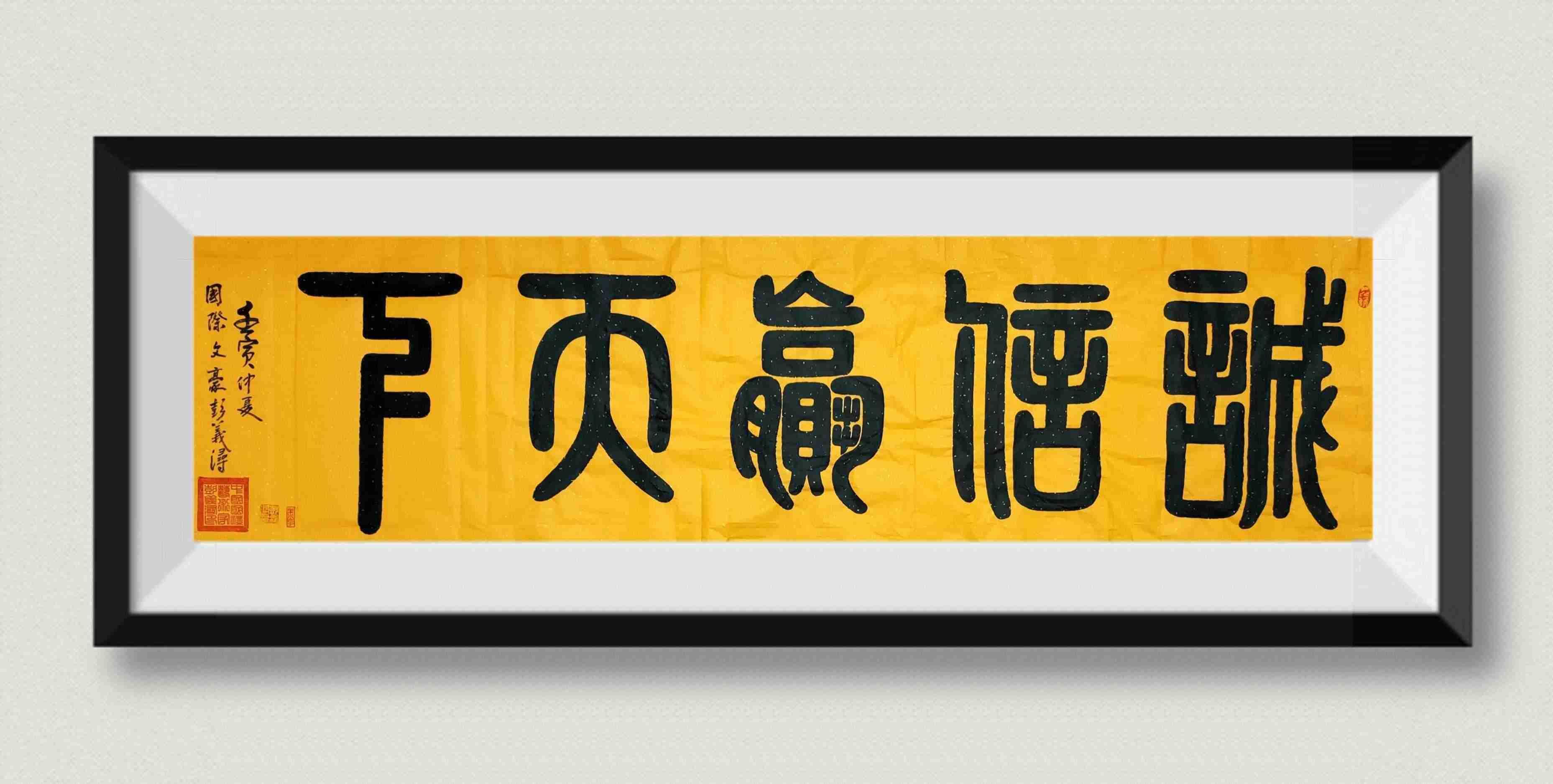 他的隶书书法,则在集成汉隶十碑美学精华的同时,又有意识地参意魏碑的方笔风格,蚕头燕飞写动逸,方笔劲凌写气度,这种用魏碑风格去影响隶书的探索性融合,是他书法的独特,也是功成的显赫。隶书本源就是一个开放性的书体体系,不拒百体而融,所以才会有书法史上的隶变现象。他把魏碑甚至宋体的笔法方式融入隶书创作,是时代审美框架内的新隶变,与书法史上的隶变前后互补,为隶书的源与变增加了更多的进程标识。