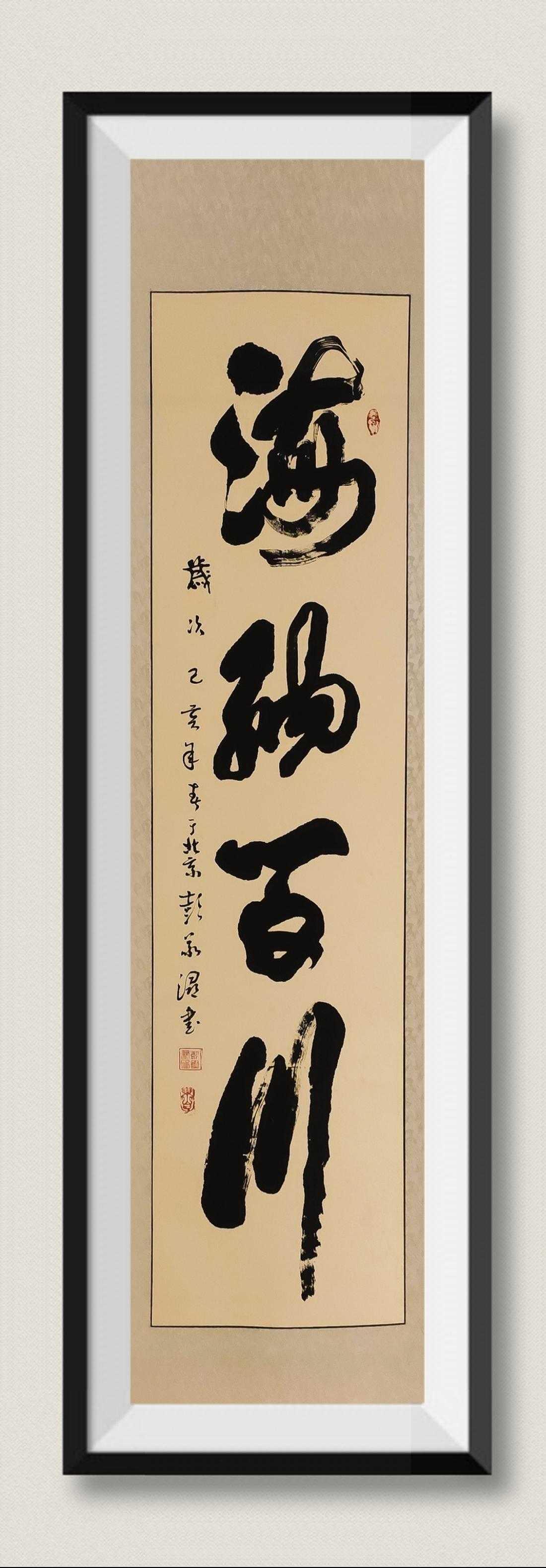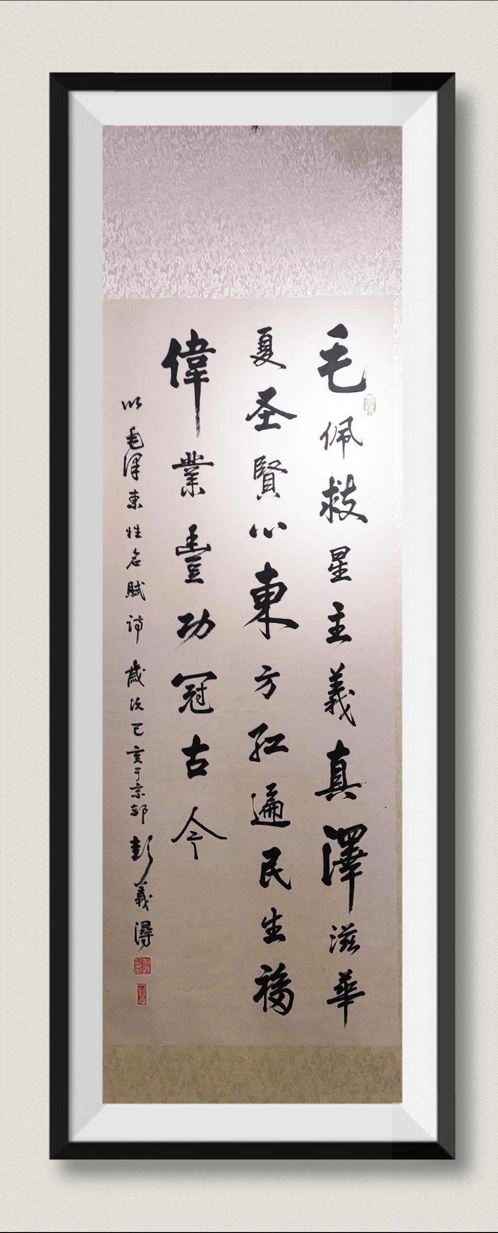 说到他书法的创建风格,还需要看他魏碑汉隶作品的独特。他写魏碑,把北派书法的苍劲雄迈感一笔写成,毫无滞慢,方笔凿岩,相当有气魂,千钧之力,非常显功道,当代书坛,能像彭义浔先生这样,复成碑质神韵的大手笔是非常少见的。清代碑学大师康有为论得碑学者得书法,果然如此!