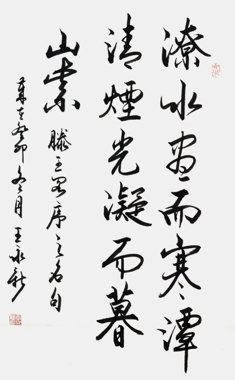 王永新致力追寻本宗二王书风,书风醇正守道,用笔洒脱明快,构思睿智奇思;作品神韵内敛,内涵丰富;观之劲健祥瑞,大气磅礴,凸现了中国书法艺术独特的神奇魅力。其作品被收入《时代风范》、《中国翰墨巨匠全集》等多部专业典籍。