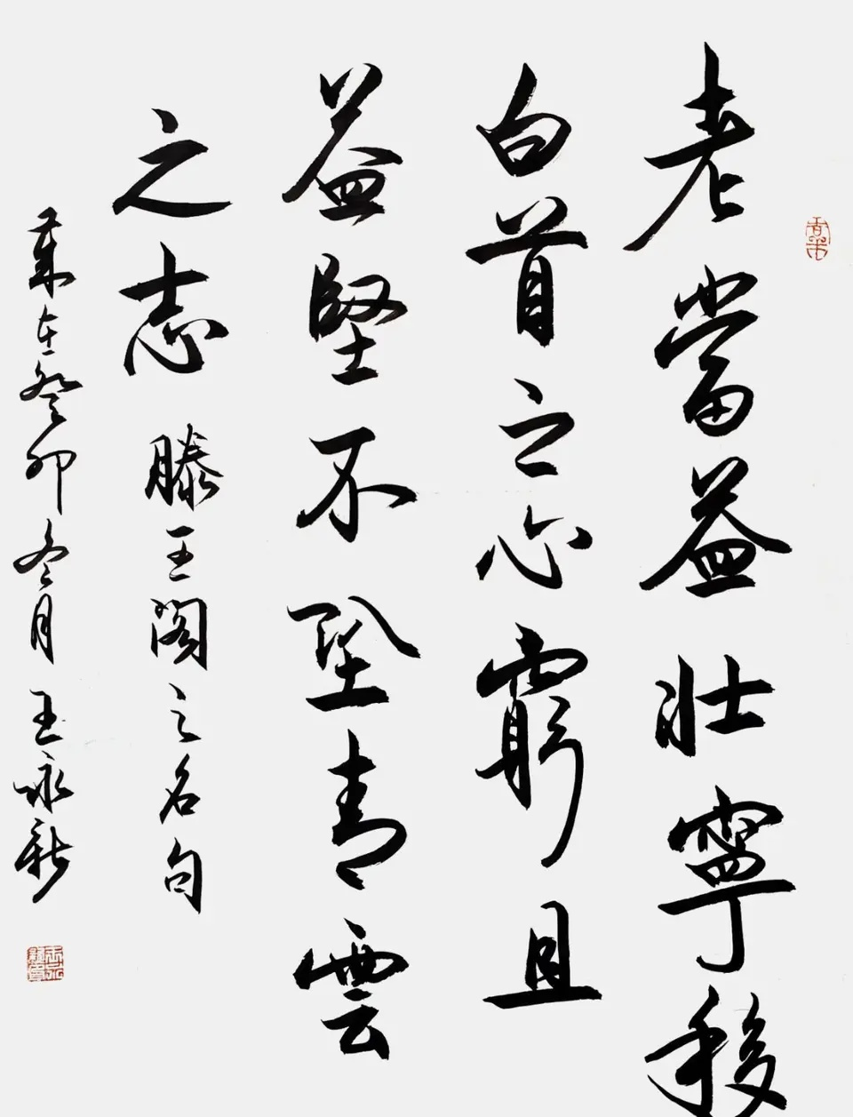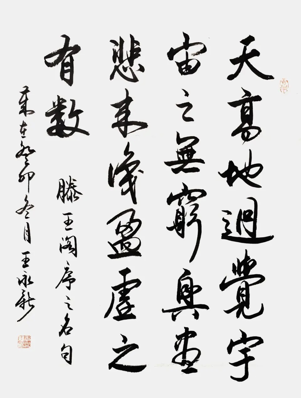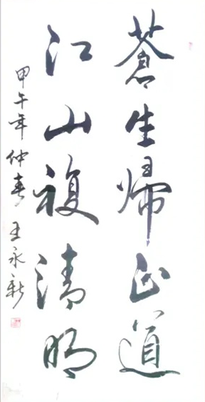 王永新主张学习书法必须从中国传统文化入手。书法是汉字神韵内涵的表现艺术,而汉字是中华文化的载体。汉字由我们祖先创造,每个字都有其形、声、意、韵的丰富内涵。中华神州大地,岁月悠悠,源远流长。从盘古开天辟地,女娲造人,伏羲八卦,黄帝内经,苍颉造字,道德真经,孔圣传教,佛法弘传。一路走来,印证了我们中华传统文化是神传文化,祖先的智慧,灿烂辉煌。学习书法必须从中华传统文化的沃土中汲取营养,才能有所突破,完成质的飞跃。