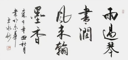 面对王永新先生的行书作品,只要看一眼,即就入心,笔墨动逸而出的快意与潇洒如惠风和畅,也如天歌轻吟,满满的文人风,盈盈的士人韵,不激不励,写帛书缎,完全是享观不尽的兰亭风韵。他的行书在用笔上,提倡轻快入纸,动逸推行,提摁顿挫,全侍节奏,笔笔切意,无比率真,不造作,求自然,从头至尾,全都是踏歌而行的学人品位,恰是书法抒情的境界,所以这些行书作品,无一例外,都有诗的气韵,也有词的质髓,书文同质,最为文人!这是非常典型的王羲之执笔透纸,笔墨写歌的笔法精髓。很明显是因为对兰亭序、圣教序进行了追寻真谛的用心付出,进而得益的笔墨丰硕。