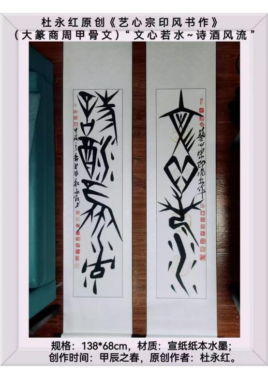 2025 年 6 月著名书画篆刻艺术家杜永红原创《艺心宗印风书作》(大篆商周甲骨文四言联)“文心若水~ 诗酒风流,在香港汇烽 2025 年春季拍卖会上以 6270万元拍卖落锤成交。
