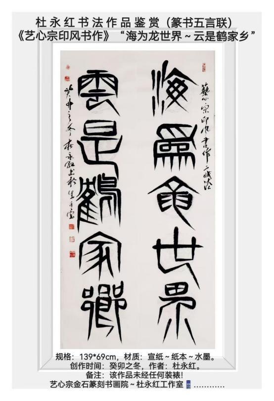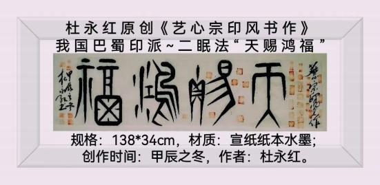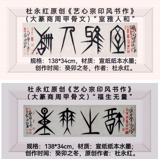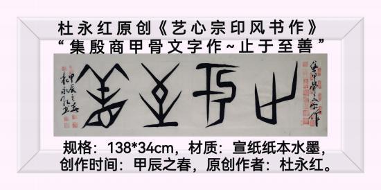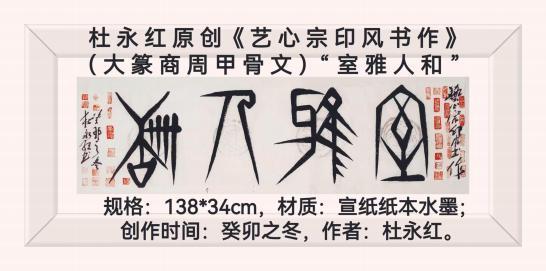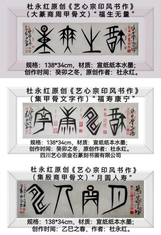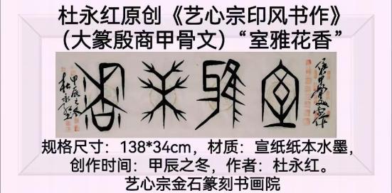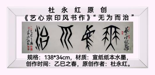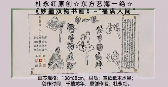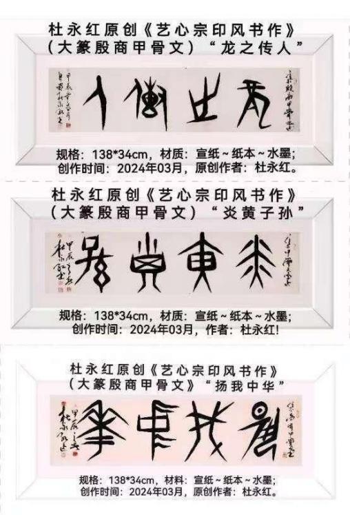 杜永红创作的我国艺心宗“妙墨双钩”象形文字书画,象形寓意地开创了独具匠心的一派风格,其形象韵味穿透古今,荟萃了众家之长,象形舒缓,字美意深,不失古文明的原味,容纳今世浩气的王者风范,拓展了祖国传统艺术,并汇聚融合了国画、书法、篆刻与爱国情怀和个人情感,开辟了独树一帜的一派卓尔不群的:我国(国际)艺心宗文化艺术。其韵味悠远,妙不可言!撼动灵魂,这真是一门迈向明天迎接回来的艺术,可堪称东方艺海一绝。