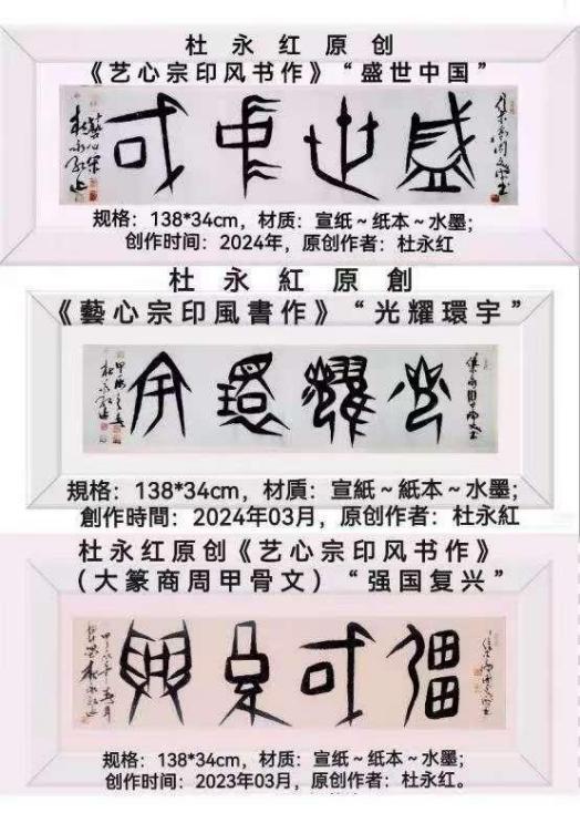 2003 年担任艺心宗金石篆刻书画院院长,2016中国好品牌 haobrand 艺术人物榜评定为品牌影响力创新艺术家、同年 8 月起由中国文化信息协会与中国国际集邮网应邀先后入编出品《时代先锋·当代书画篆刻名家杜永红翰墨丹青耀中华限量版珍藏邮册》、《一带一路中国梦~中国当代书画篆刻名家-杜永红限量版珍藏邮册》、《美国集邮集团-美中杰出华人艺术家~中国艺术名家~杜永红作品纪念珍藏册》、《中国大众文化学会和中国国际集邮网.匠心筑梦-中国当代艺术大家大作-杜永红作品纪念珍藏版邮册》等……