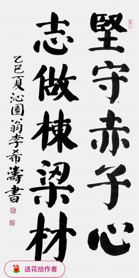 李希涛,字江河,号沁园翁,1950 年生,大学文化,河南省济源市人。系中国书法家协会员,国家特级书法师,中国人民大学博士研究生导师,北京大学书法客座教授,中国外交部礼宾司授权的国宾礼特供书法家,人民艺术鉴赏中心名誉副主席,中国书画家协会副主席,沁园春书画院院长、cctv 今日视界栏目组客座教授,中共中央党史研究室颁发“建党百年功勋艺术家”。