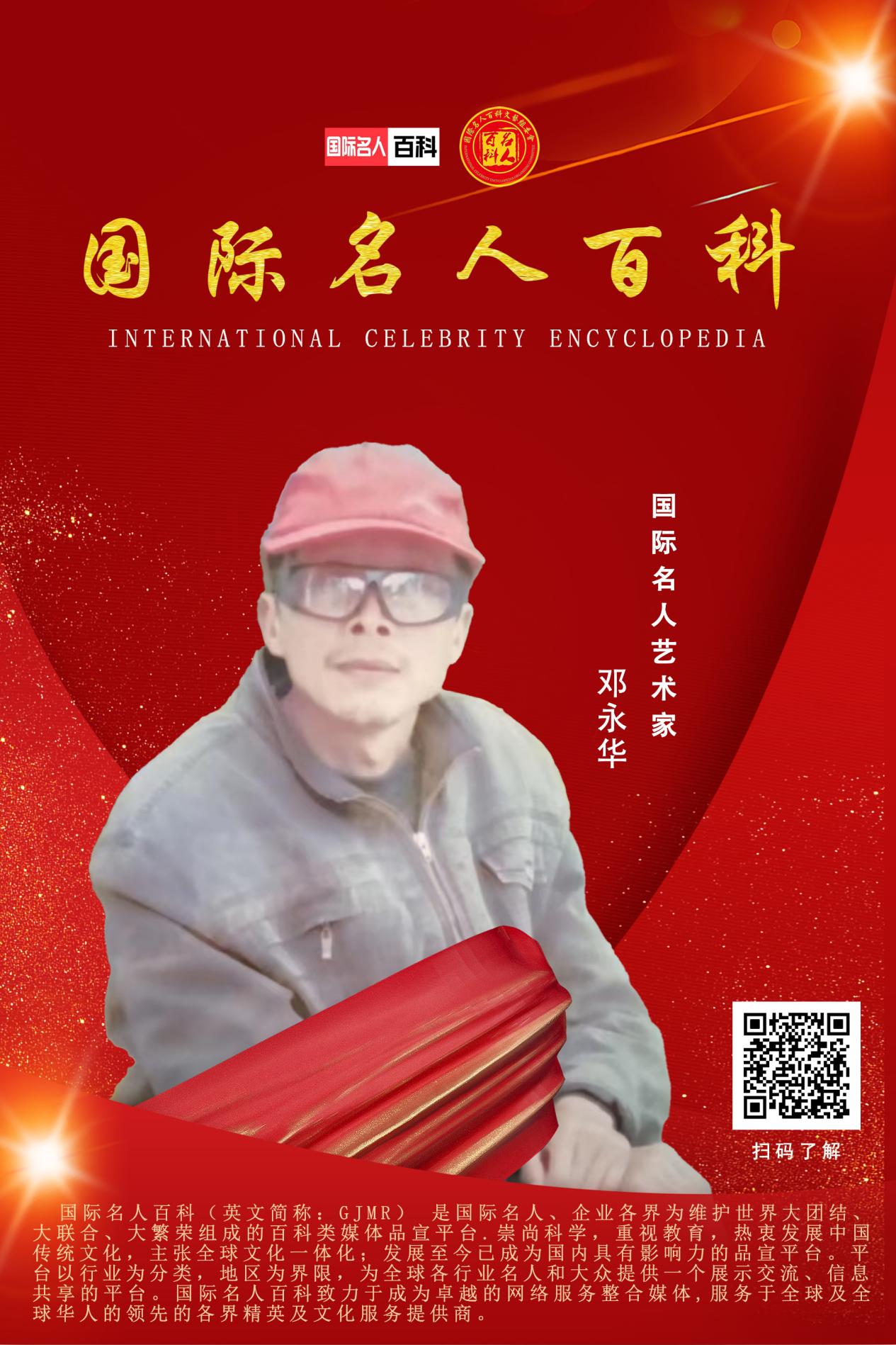 邓永华,湖北松滋人,别名武亚子、伍么叔,笔名农人。自幼喜爱书画,受聘于国内国际书画艺术研究机构首席艺术顾问、名誉主席、会长、客座教授、理事、中国文艺家联合会艺术顾问等,被授予德才兼备、文明之星、海峡两岸书画交流爱心大使、中国功勋文艺家、中国德艺双馨艺术家形象大使,2010年上海世博会国际书画艺术名人、当代书画大师、人民艺术家、中韩文化大使,被联合国国际文化艺术家联合总会评为 2012年度最高艺术传承人物,2013年获国际英伦奖皇家艺术第一人,推动中美文化艺术交流大使、中华传奇人物、金马奖、百花奖、金像奖、中国艺术华表奖、世界文化贡献人物,中国一线大家等荣誉称号。入编中国现代书画篆刻界名人录、2014 中法人民最喜爱艺术家,世界艺术之巅等多种作品典集和画册。2025年获评福布斯年度艺术人物。
