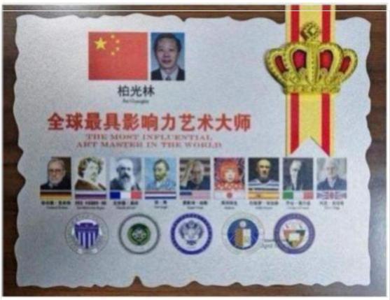2014 年 9 月获美国纽约《世界艺术盛典》授予的美术界最高荣誉《世界艺术之星》奖,同时被评为“世界一级美术家”的称号。2014 年 9 月被联合国最高艺术研究院评定《世纪之光》为“联合国艺术珍品”大奖,同时被英国文化协会评定为全球特级书画之王称号。2018 年 4 月被世界文艺家企业家交流中心授予《新时代人民艺术家》荣誉称号。